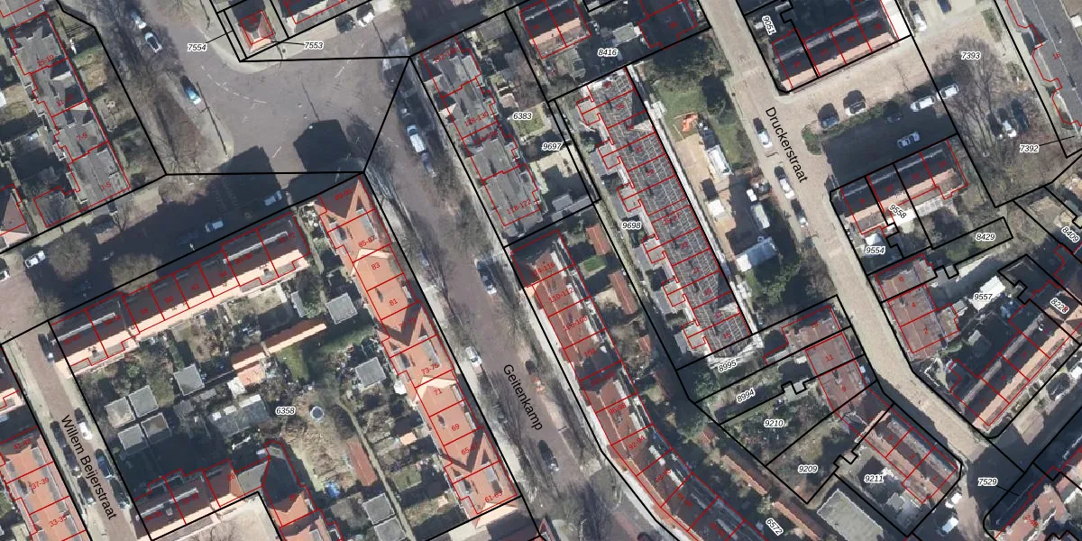 Het perceel waarop Geitenkamp 114 staat heeft een oppervlakte van 2505 m². Dit is een zeer groot perceel. De perceeloppervlakte wordt geregistreerd door het Kadaster. Gedetailleerde informatie over de maten van dit perceel kunt u vinden in het rapport Kadastrale kaart met maatvoering van Geitenkamp 114.