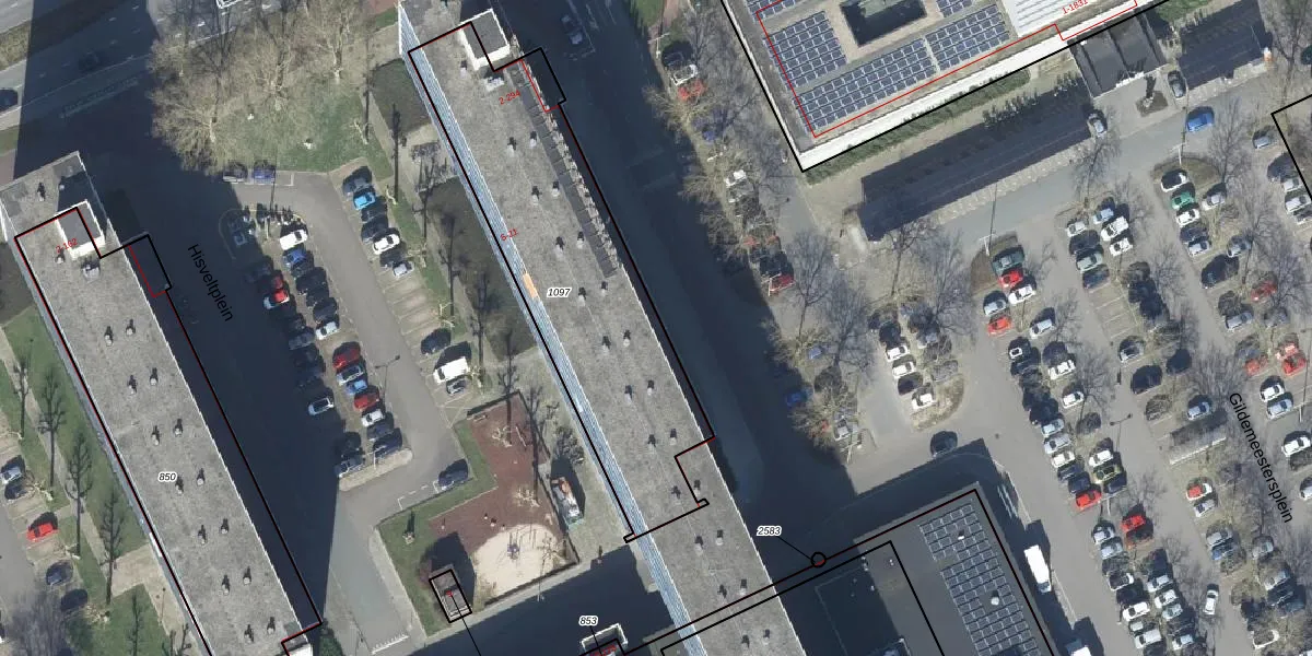 Het perceel waarop Gildemeestersplein 2-M staat heeft een oppervlakte van 1327 m². Dit is een zeer groot perceel. De perceeloppervlakte wordt geregistreerd door het Kadaster. Gedetailleerde informatie over de maten van dit perceel kunt u vinden in het rapport Kadastrale kaart met maatvoering van Gildemeestersplein 2-M.