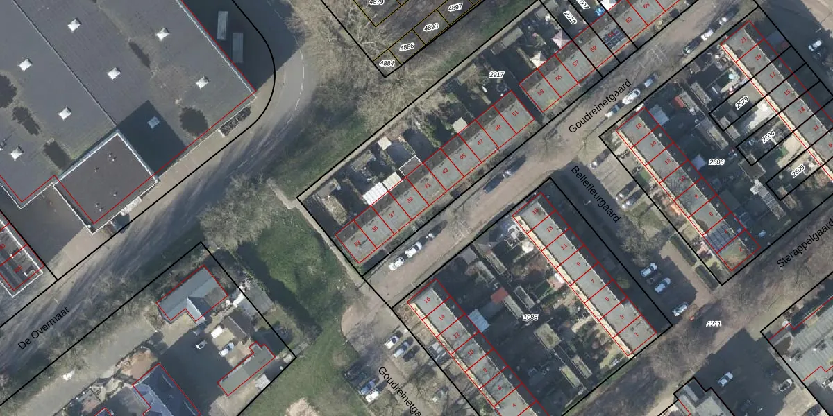 Het perceel waarop Goudreinetgaard 39 staat heeft een oppervlakte van 1843 m². Dit is een zeer groot perceel. De perceeloppervlakte wordt geregistreerd door het Kadaster. Gedetailleerde informatie over de maten van dit perceel kunt u vinden in het rapport Kadastrale kaart met maatvoering van Goudreinetgaard 39.