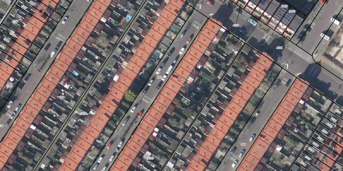 Het perceel waarop Goudwindestraat 67 staat heeft een oppervlakte van 4509 m². Dit is een zeer groot perceel. De perceeloppervlakte wordt geregistreerd door het Kadaster. Gedetailleerde informatie over de maten van dit perceel kunt u vinden in het rapport Kadastrale kaart met maatvoering van Goudwindestraat 67.