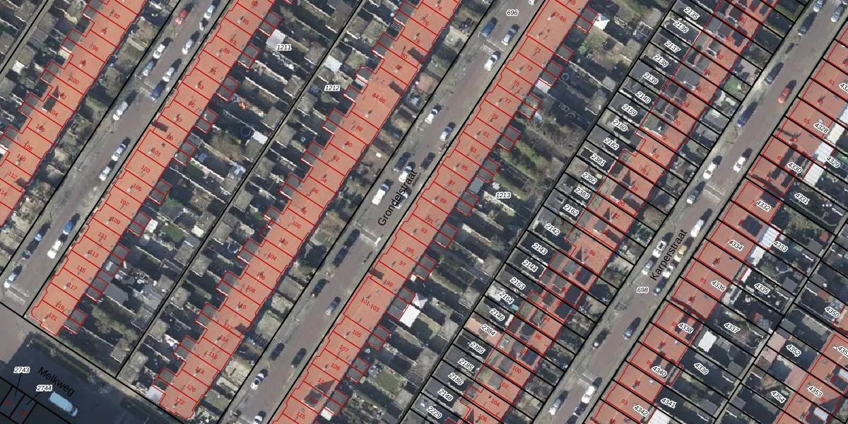 Het perceel waarop Grondelstraat 91 staat heeft een oppervlakte van 4501 m². Dit is een zeer groot perceel. De perceeloppervlakte wordt geregistreerd door het Kadaster. Gedetailleerde informatie over de maten van dit perceel kunt u vinden in het rapport Kadastrale kaart met maatvoering van Grondelstraat 91.