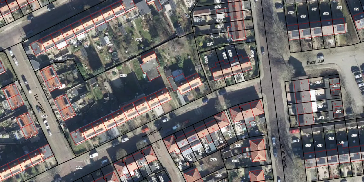 Het perceel waarop Hertenlaan 55 staat heeft een oppervlakte van 3420 m². Dit is een zeer groot perceel. De perceeloppervlakte wordt geregistreerd door het Kadaster. Gedetailleerde informatie over de maten van dit perceel kunt u vinden in het rapport Kadastrale kaart met maatvoering van Hertenlaan 55.