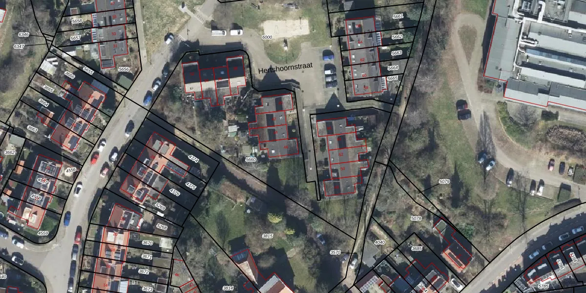 Het perceel waarop Hertshoornstraat 46 staat heeft een oppervlakte van 2386 m². Dit is een zeer groot perceel. De perceeloppervlakte wordt geregistreerd door het Kadaster. Gedetailleerde informatie over de maten van dit perceel kunt u vinden in het rapport Kadastrale kaart met maatvoering van Hertshoornstraat 46.
