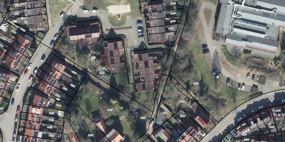 Het perceel waarop Hertshoornstraat 52 staat heeft een oppervlakte van 2386 m². Dit is een zeer groot perceel. De perceeloppervlakte wordt geregistreerd door het Kadaster. Gedetailleerde informatie over de maten van dit perceel kunt u vinden in het rapport Kadastrale kaart met maatvoering van Hertshoornstraat 52.