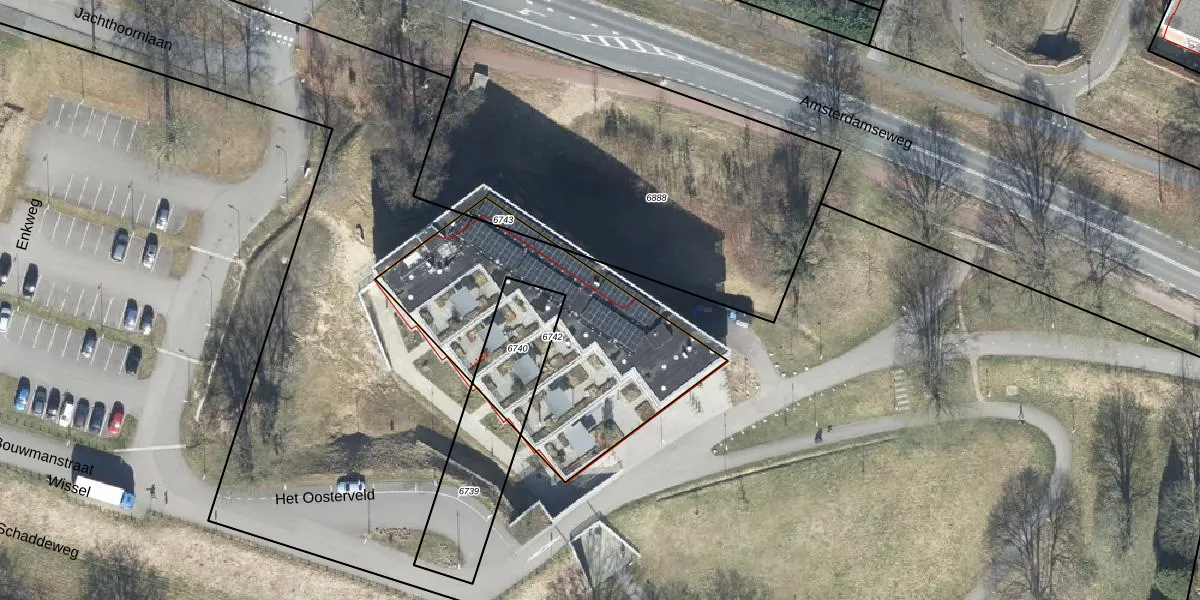 Het perceel waarop Het Oosterveld 1-34 staat heeft een oppervlakte van 1070 m². Dit is een zeer groot perceel. De perceeloppervlakte wordt geregistreerd door het Kadaster. Gedetailleerde informatie over de maten van dit perceel kunt u vinden in het rapport Kadastrale kaart met maatvoering van Het Oosterveld 1-34.
