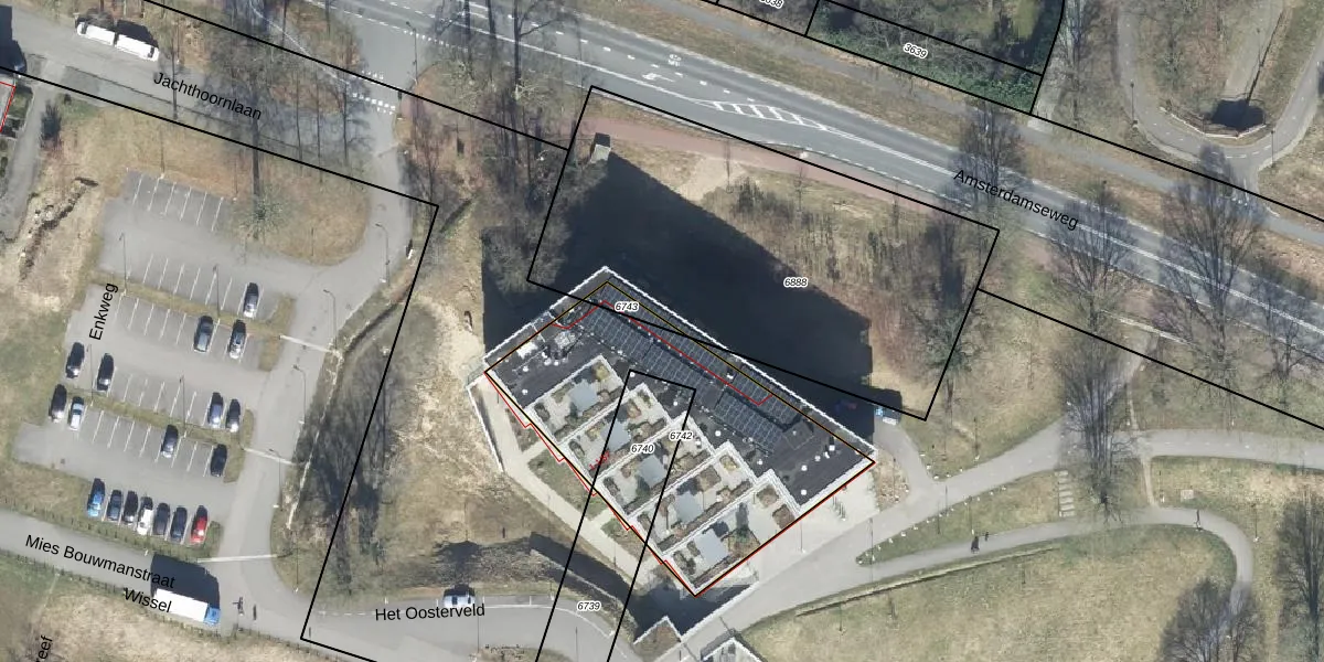 Het perceel waarop Het Oosterveld 1-54 staat heeft een oppervlakte van 1070 m². Dit is een zeer groot perceel. De perceeloppervlakte wordt geregistreerd door het Kadaster. Gedetailleerde informatie over de maten van dit perceel kunt u vinden in het rapport Kadastrale kaart met maatvoering van Het Oosterveld 1-54.