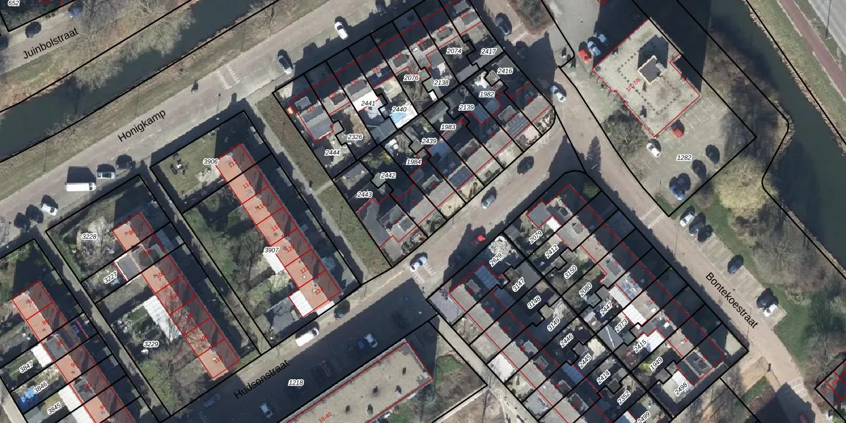 Gebruik de zoekbalk of klik op een perceel voor informatie over de adressen binnen dit perceel.