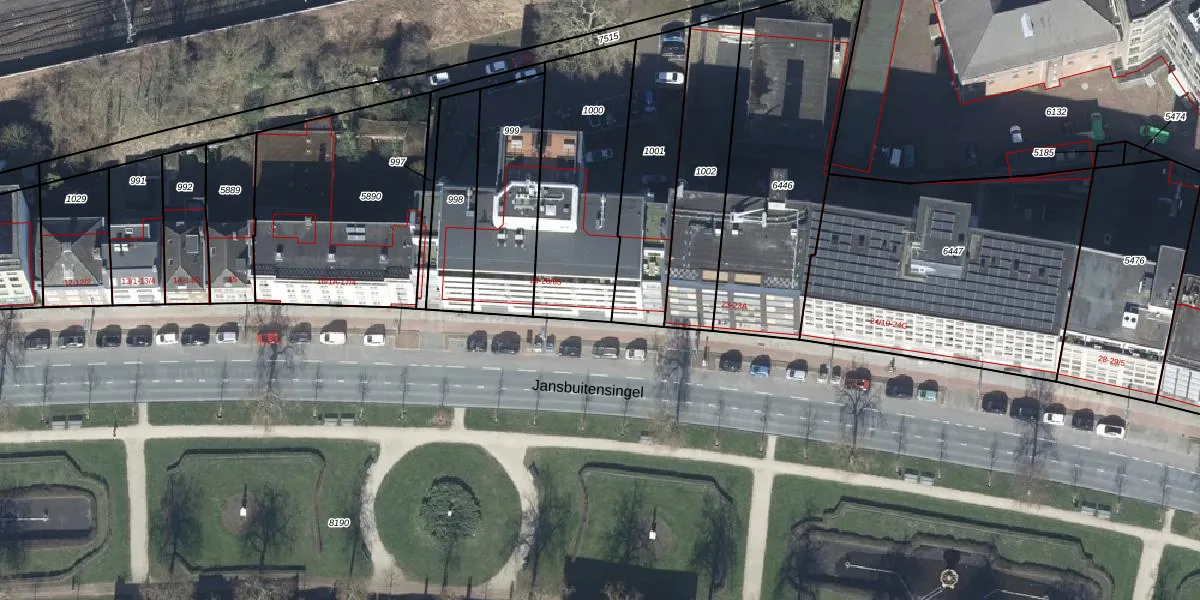 Het perceel waarop Jansbuitensingel 20-51 staat heeft een oppervlakte van 635 m². Dit is een groot perceel. De perceeloppervlakte wordt geregistreerd door het Kadaster. Gedetailleerde informatie over de maten van dit perceel kunt u vinden in het rapport Kadastrale kaart met maatvoering van Jansbuitensingel 20-51.