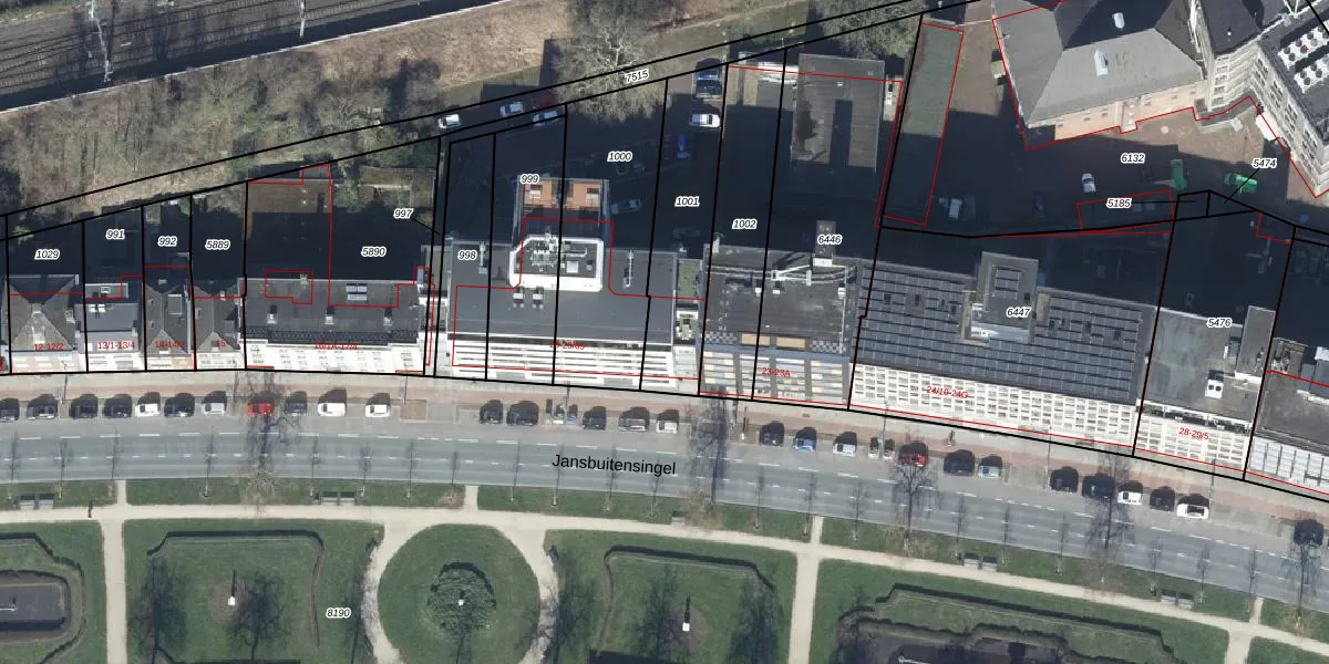 Het perceel waarop Jansbuitensingel 20-64 staat heeft een oppervlakte van 430 m². Dit is een groot perceel. De perceeloppervlakte wordt geregistreerd door het Kadaster. Gedetailleerde informatie over de maten van dit perceel kunt u vinden in het rapport Kadastrale kaart met maatvoering van Jansbuitensingel 20-64.