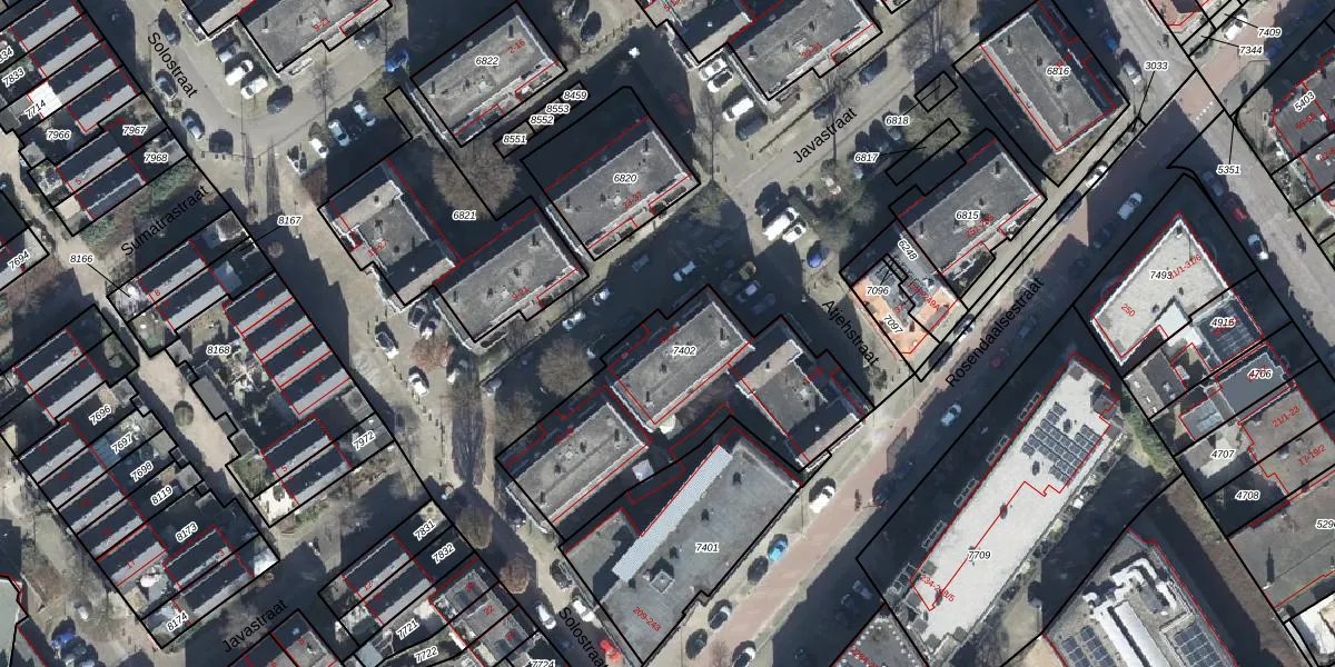 Het perceel waarop Javastraat 42 staat heeft een oppervlakte van 965 m². Dit is een groot perceel. De perceeloppervlakte wordt geregistreerd door het Kadaster. Gedetailleerde informatie over de maten van dit perceel kunt u vinden in het rapport Kadastrale kaart met maatvoering van Javastraat 42.