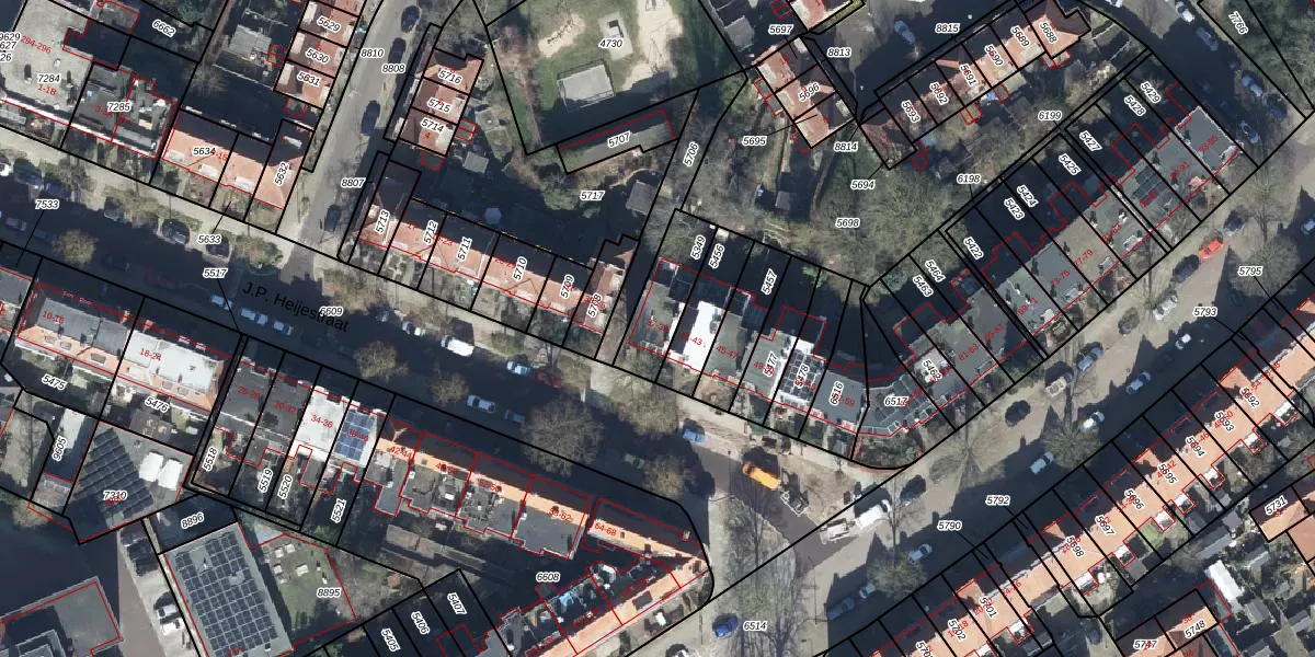 Het perceel waarop J.P. Heijestraat 39 staat heeft een oppervlakte van 176 m². Dit is een middelgroot perceel. De perceeloppervlakte wordt geregistreerd door het Kadaster. Gedetailleerde informatie over de maten van dit perceel kunt u vinden in het rapport Kadastrale kaart met maatvoering van J.P. Heijestraat 39.