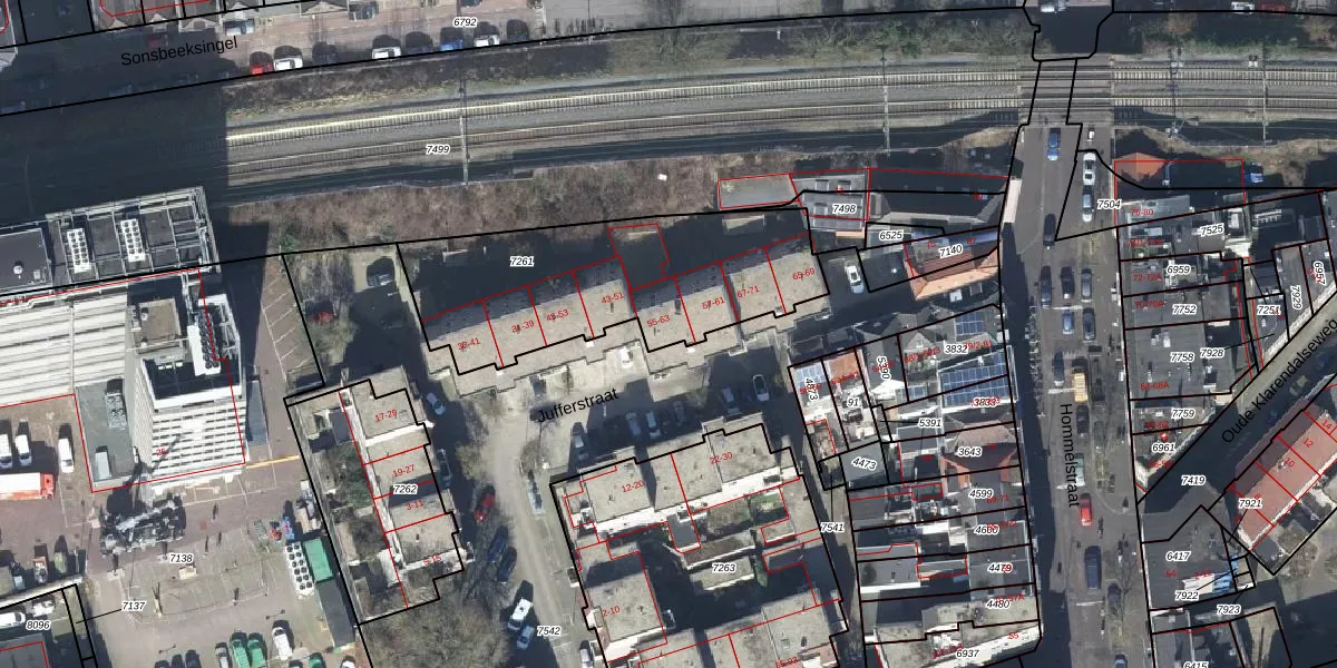 Het perceel waarop Jufferstraat 55 staat heeft een oppervlakte van 985 m². Dit is een groot perceel. De perceeloppervlakte wordt geregistreerd door het Kadaster. Gedetailleerde informatie over de maten van dit perceel kunt u vinden in het rapport Kadastrale kaart met maatvoering van Jufferstraat 55.