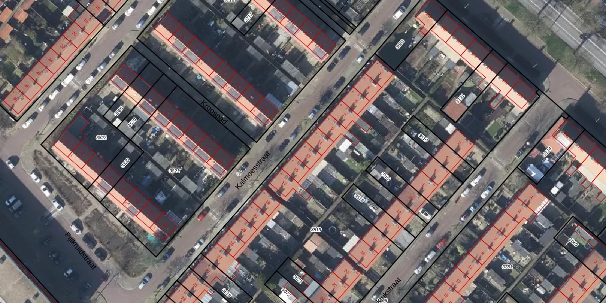 Het perceel waarop Kalmoesstraat 13 staat heeft een oppervlakte van 5337 m². Dit is een zeer groot perceel. De perceeloppervlakte wordt geregistreerd door het Kadaster. Gedetailleerde informatie over de maten van dit perceel kunt u vinden in het rapport Kadastrale kaart met maatvoering van Kalmoesstraat 13.