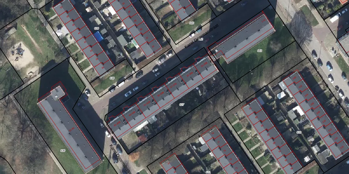 Het perceel waarop Karel Doormanstraat 37-B staat heeft een oppervlakte van 1813 m². Dit is een zeer groot perceel. De perceeloppervlakte wordt geregistreerd door het Kadaster. Gedetailleerde informatie over de maten van dit perceel kunt u vinden in het rapport Kadastrale kaart met maatvoering van Karel Doormanstraat 37-B.