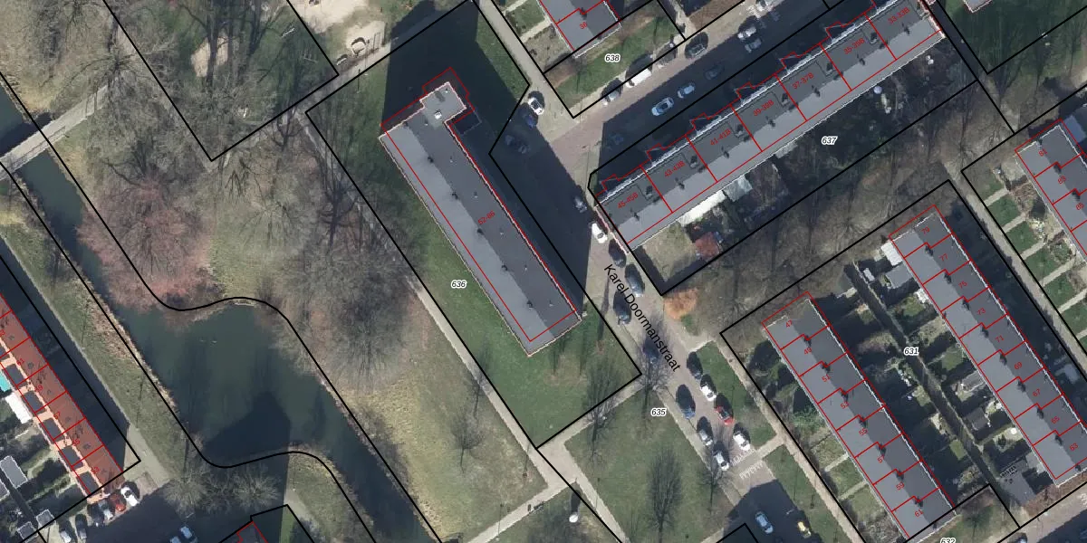 Het perceel waarop Karel Doormanstraat 52-E staat heeft een oppervlakte van 2104 m². Dit is een zeer groot perceel. De perceeloppervlakte wordt geregistreerd door het Kadaster. Gedetailleerde informatie over de maten van dit perceel kunt u vinden in het rapport Kadastrale kaart met maatvoering van Karel Doormanstraat 52-E.