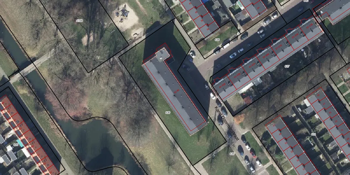 Het perceel waarop Karel Doormanstraat 82 staat heeft een oppervlakte van 2104 m². Dit is een zeer groot perceel. De perceeloppervlakte wordt geregistreerd door het Kadaster. Gedetailleerde informatie over de maten van dit perceel kunt u vinden in het rapport Kadastrale kaart met maatvoering van Karel Doormanstraat 82.