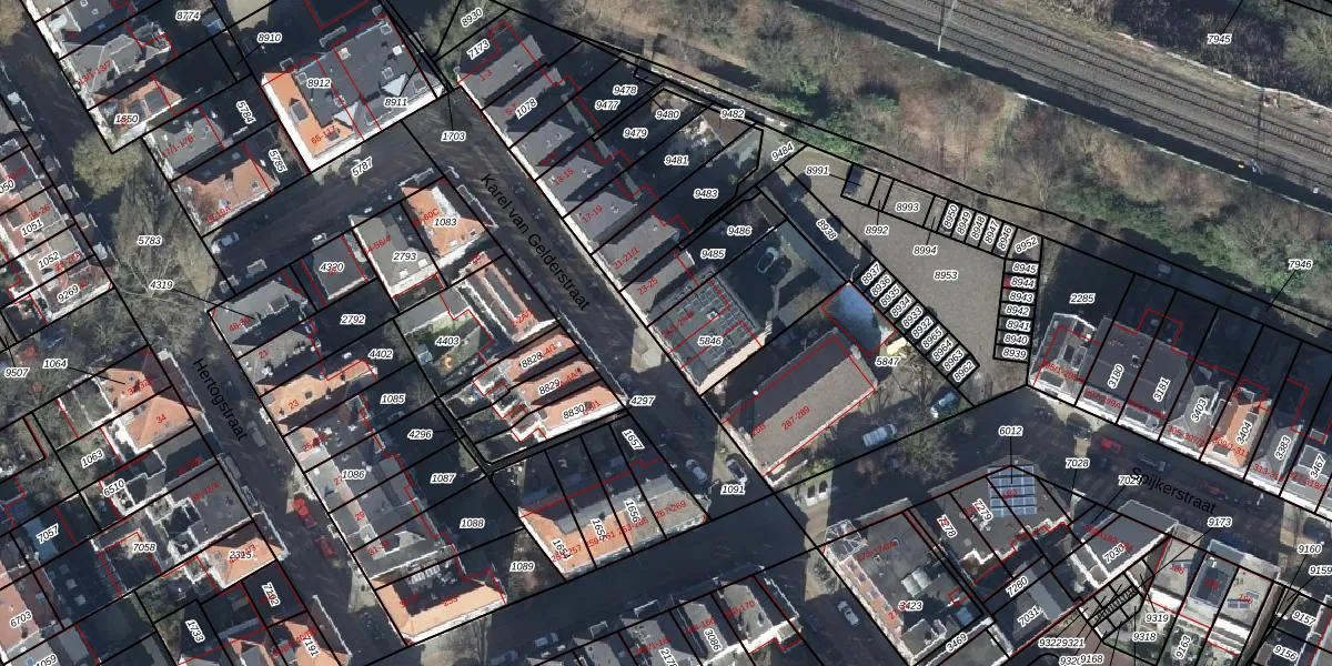 Het perceel waarop Karel van Gelderstraat 25-1 staat heeft een oppervlakte van 355 m². Dit is een groot perceel. De perceeloppervlakte wordt geregistreerd door het Kadaster. Gedetailleerde informatie over de maten van dit perceel kunt u vinden in het rapport Kadastrale kaart met maatvoering van Karel van Gelderstraat 25-1.