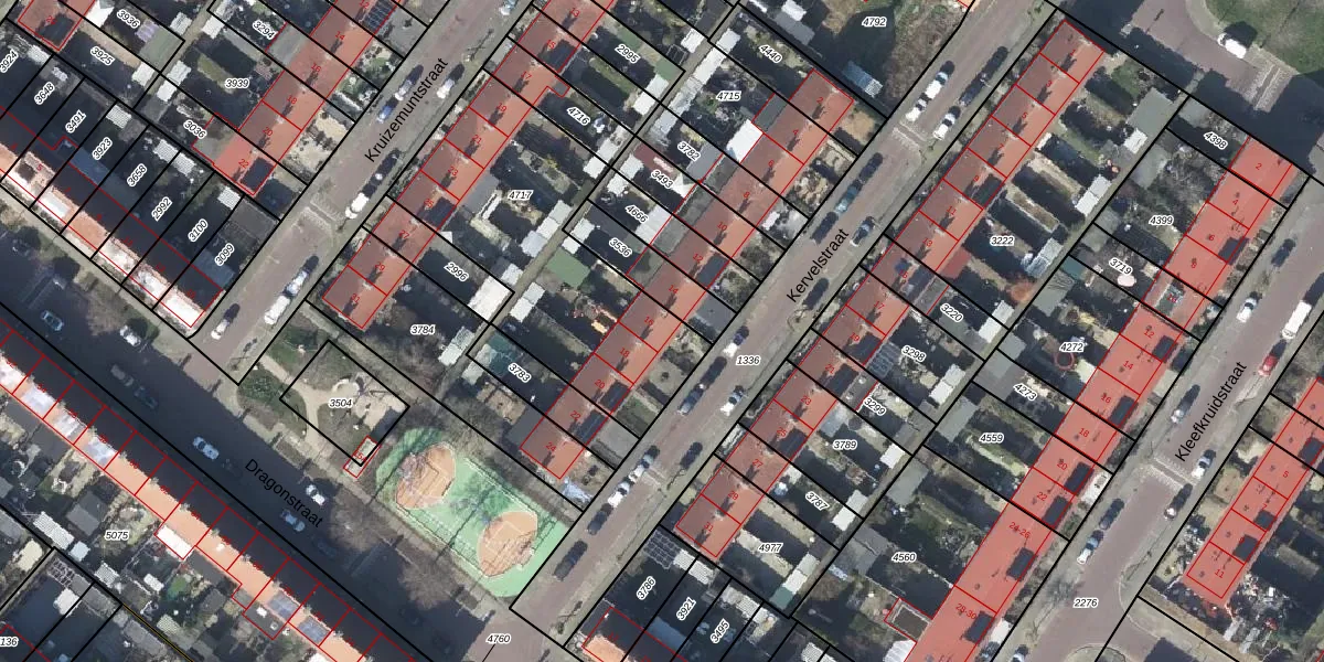 Het perceel waarop Kervelstraat 16 staat heeft een oppervlakte van 1100 m². Dit is een zeer groot perceel. De perceeloppervlakte wordt geregistreerd door het Kadaster. Gedetailleerde informatie over de maten van dit perceel kunt u vinden in het rapport Kadastrale kaart met maatvoering van Kervelstraat 16.