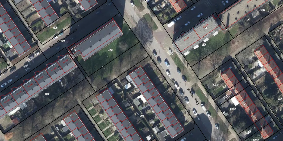 Het perceel waarop Keulse Slag 100 staat heeft een oppervlakte van 3203 m². Dit is een zeer groot perceel. De perceeloppervlakte wordt geregistreerd door het Kadaster. Gedetailleerde informatie over de maten van dit perceel kunt u vinden in het rapport Kadastrale kaart met maatvoering van Keulse Slag 100.