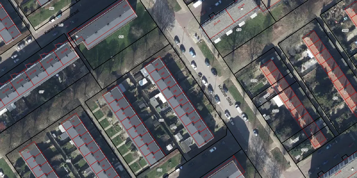Het perceel waarop Keulse Slag 106 staat heeft een oppervlakte van 3203 m². Dit is een zeer groot perceel. De perceeloppervlakte wordt geregistreerd door het Kadaster. Gedetailleerde informatie over de maten van dit perceel kunt u vinden in het rapport Kadastrale kaart met maatvoering van Keulse Slag 106.