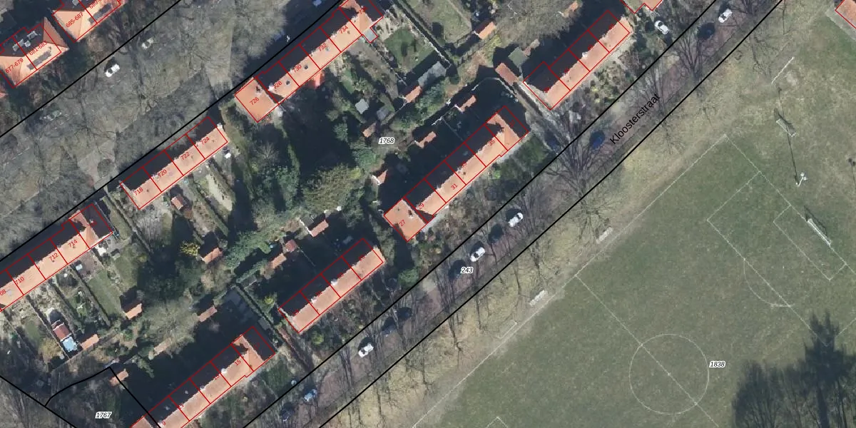 Het perceel waarop Kloosterstraat 29 staat heeft een oppervlakte van 1,3 ha. Dit is een zeer groot perceel. De perceeloppervlakte wordt geregistreerd door het Kadaster. Gedetailleerde informatie over de maten van dit perceel kunt u vinden in het rapport Kadastrale kaart met maatvoering van Kloosterstraat 29.
