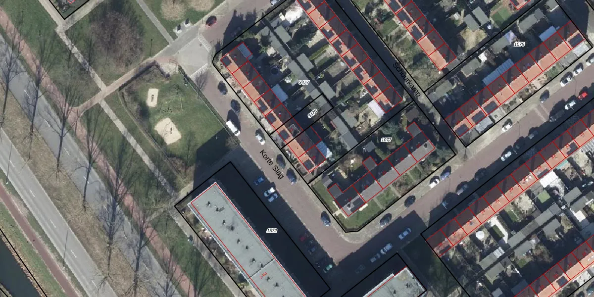 Het perceel waarop Korte Slag 13 staat heeft een oppervlakte van 2291 m². Dit is een zeer groot perceel. De perceeloppervlakte wordt geregistreerd door het Kadaster. Gedetailleerde informatie over de maten van dit perceel kunt u vinden in het rapport Kadastrale kaart met maatvoering van Korte Slag 13.