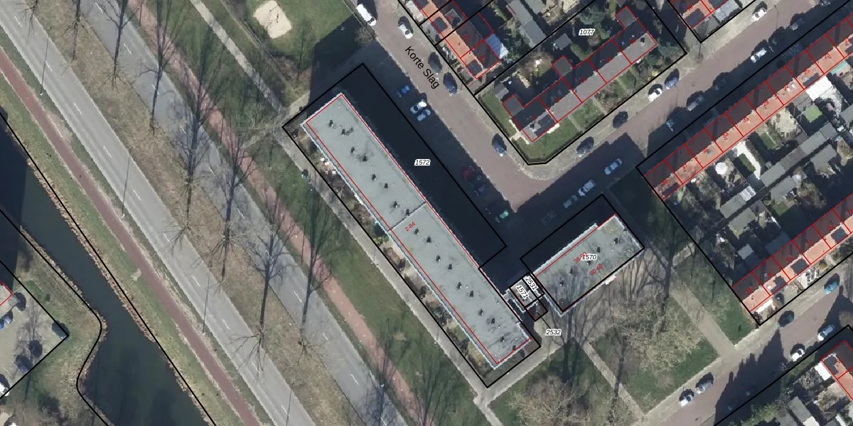 Het perceel waarop Korte Slag 24 staat heeft een oppervlakte van 1676 m². Dit is een zeer groot perceel. De perceeloppervlakte wordt geregistreerd door het Kadaster. Gedetailleerde informatie over de maten van dit perceel kunt u vinden in het rapport Kadastrale kaart met maatvoering van Korte Slag 24.