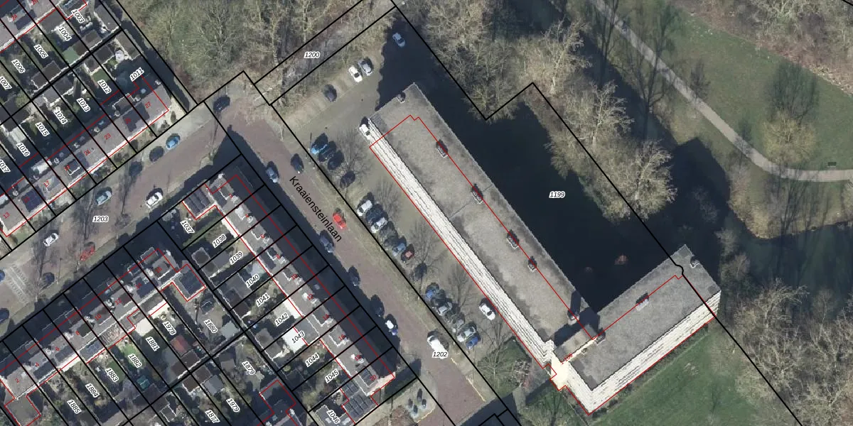 Het perceel waarop Kraaiensteinlaan 1-G staat heeft een oppervlakte van 6900 m². Dit is een zeer groot perceel. De perceeloppervlakte wordt geregistreerd door het Kadaster. Gedetailleerde informatie over de maten van dit perceel kunt u vinden in het rapport Kadastrale kaart met maatvoering van Kraaiensteinlaan 1-G.