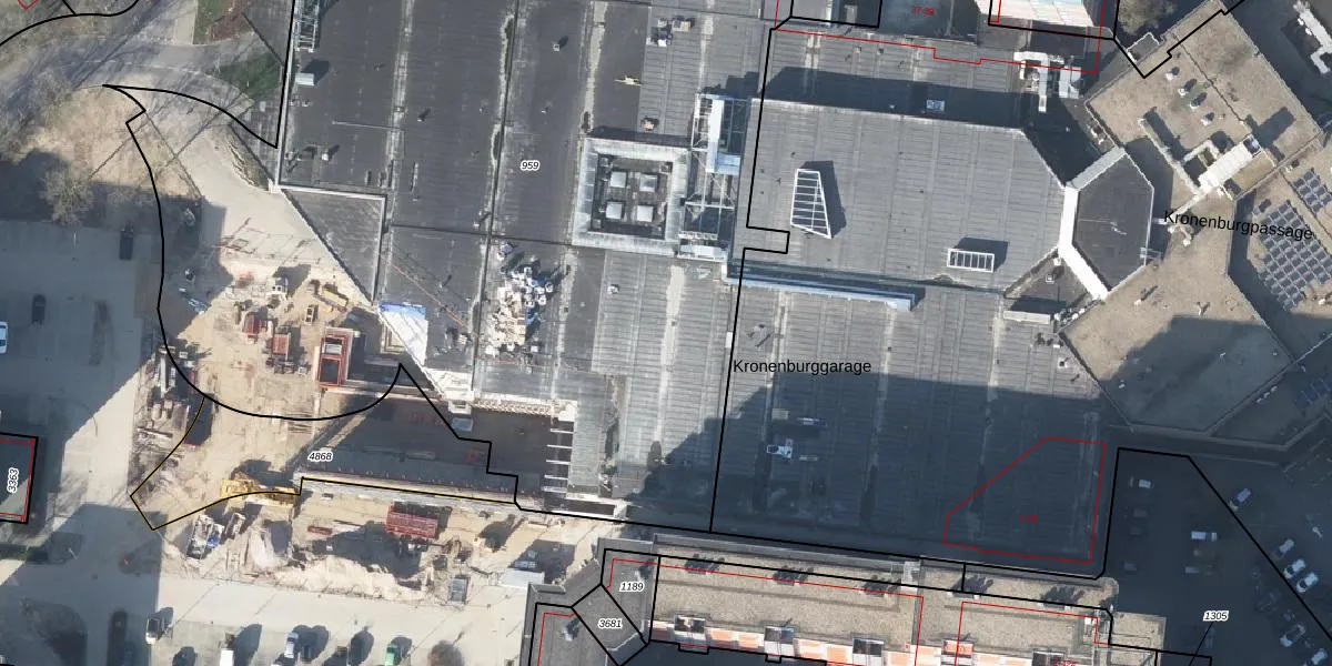 Het perceel waarop Kronenburgpassage 112 staat heeft een oppervlakte van 6397 m². Dit is een zeer groot perceel. De perceeloppervlakte wordt geregistreerd door het Kadaster. Gedetailleerde informatie over de maten van dit perceel kunt u vinden in het rapport Kadastrale kaart met maatvoering van Kronenburgpassage 112.