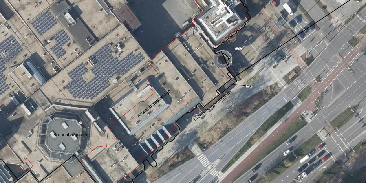 Het perceel waarop Kronenburgpassage 7 staat heeft een oppervlakte van 3,4 ha. Dit is een zeer groot perceel. De perceeloppervlakte wordt geregistreerd door het Kadaster. Gedetailleerde informatie over de maten van dit perceel kunt u vinden in het rapport Kadastrale kaart met maatvoering van Kronenburgpassage 7.