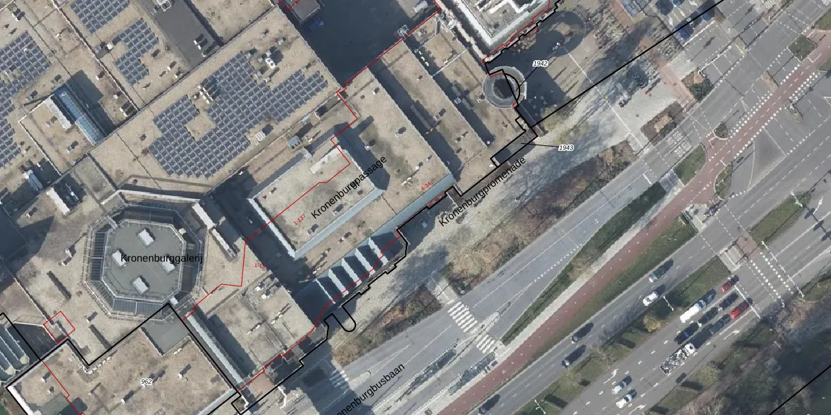 Het perceel waarop Kronenburgpromenade 16 staat heeft een oppervlakte van 3,4 ha. Dit is een zeer groot perceel. De perceeloppervlakte wordt geregistreerd door het Kadaster. Gedetailleerde informatie over de maten van dit perceel kunt u vinden in het rapport Kadastrale kaart met maatvoering van Kronenburgpromenade 16.