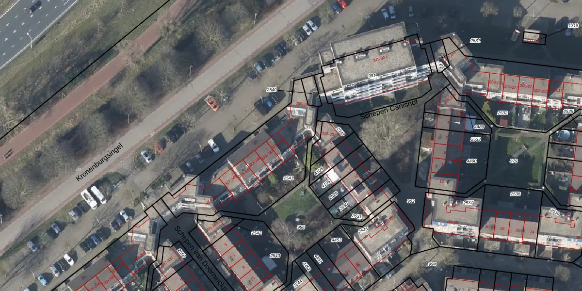 Het perceel waarop Kronenburgsingel 317 staat heeft een oppervlakte van 1102 m². Dit is een zeer groot perceel. De perceeloppervlakte wordt geregistreerd door het Kadaster. Gedetailleerde informatie over de maten van dit perceel kunt u vinden in het rapport Kadastrale kaart met maatvoering van Kronenburgsingel 317.
