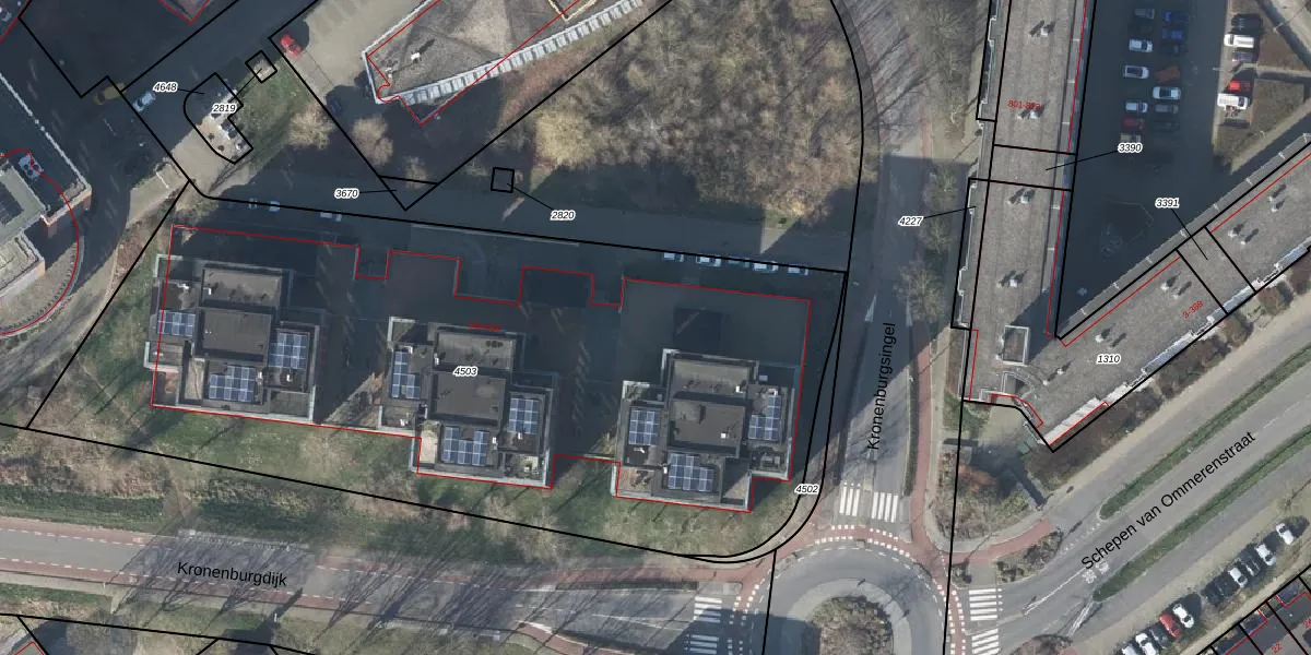 Het perceel waarop Kroonpark 400 staat heeft een oppervlakte van 4695 m². Dit is een zeer groot perceel. De perceeloppervlakte wordt geregistreerd door het Kadaster. Gedetailleerde informatie over de maten van dit perceel kunt u vinden in het rapport Kadastrale kaart met maatvoering van Kroonpark 400.