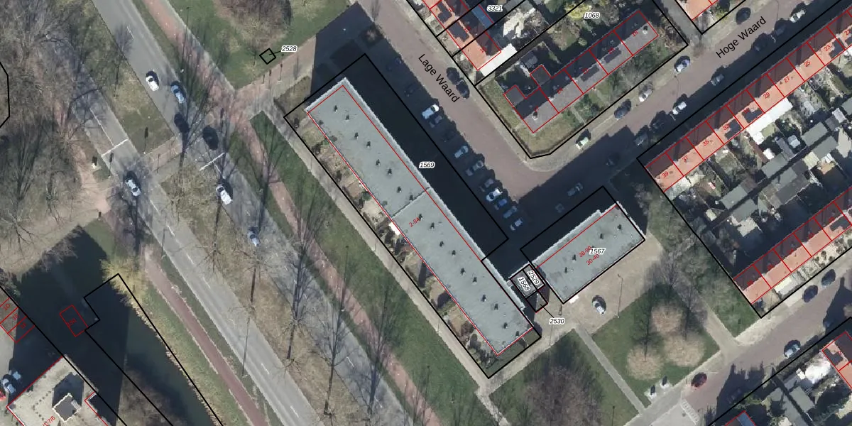 Het perceel waarop Lage Waard 48 staat heeft een oppervlakte van 1676 m². Dit is een zeer groot perceel. De perceeloppervlakte wordt geregistreerd door het Kadaster. Gedetailleerde informatie over de maten van dit perceel kunt u vinden in het rapport Kadastrale kaart met maatvoering van Lage Waard 48.