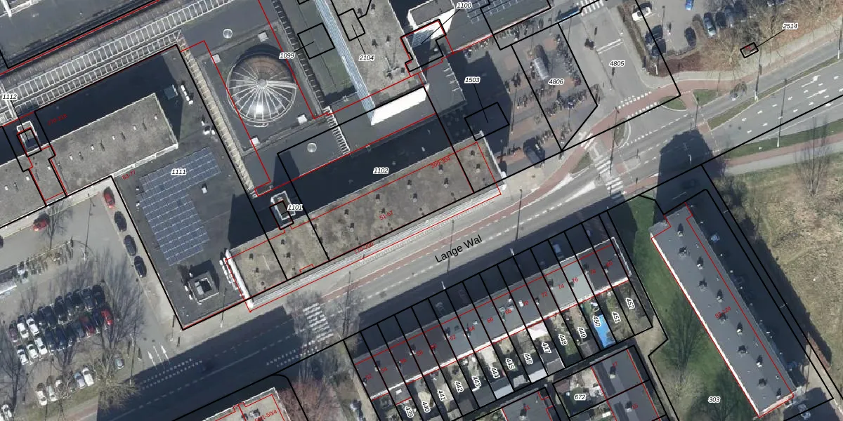 Het perceel waarop Lange Wal 51 staat heeft een oppervlakte van 1067 m². Dit is een zeer groot perceel. De perceeloppervlakte wordt geregistreerd door het Kadaster. Gedetailleerde informatie over de maten van dit perceel kunt u vinden in het rapport Kadastrale kaart met maatvoering van Lange Wal 51.