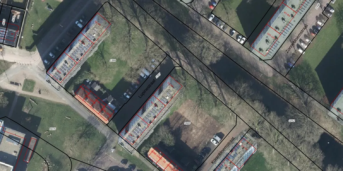 Het perceel waarop Lupinestraat 1-3 staat heeft een oppervlakte van 2620 m². Dit is een zeer groot perceel. De perceeloppervlakte wordt geregistreerd door het Kadaster. Gedetailleerde informatie over de maten van dit perceel kunt u vinden in het rapport Kadastrale kaart met maatvoering van Lupinestraat 1-3.