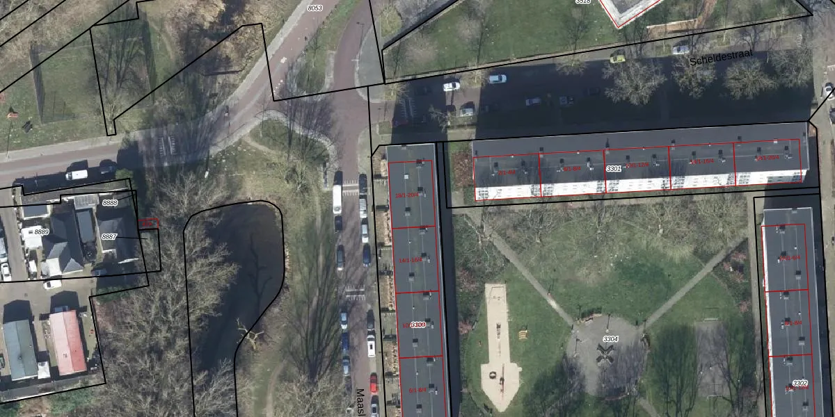Maaslaan 18-4 is gelegen op kadastraal perceel AHM01T3300. Deze kadastrale aanduiding is uniek en wordt gebruikt door het Kadaster om eigendomsrechten en andere zakelijke rechten vast te leggen. Het perceel maakt onderdeel uit van de kadastrale gemeente Arnhem.