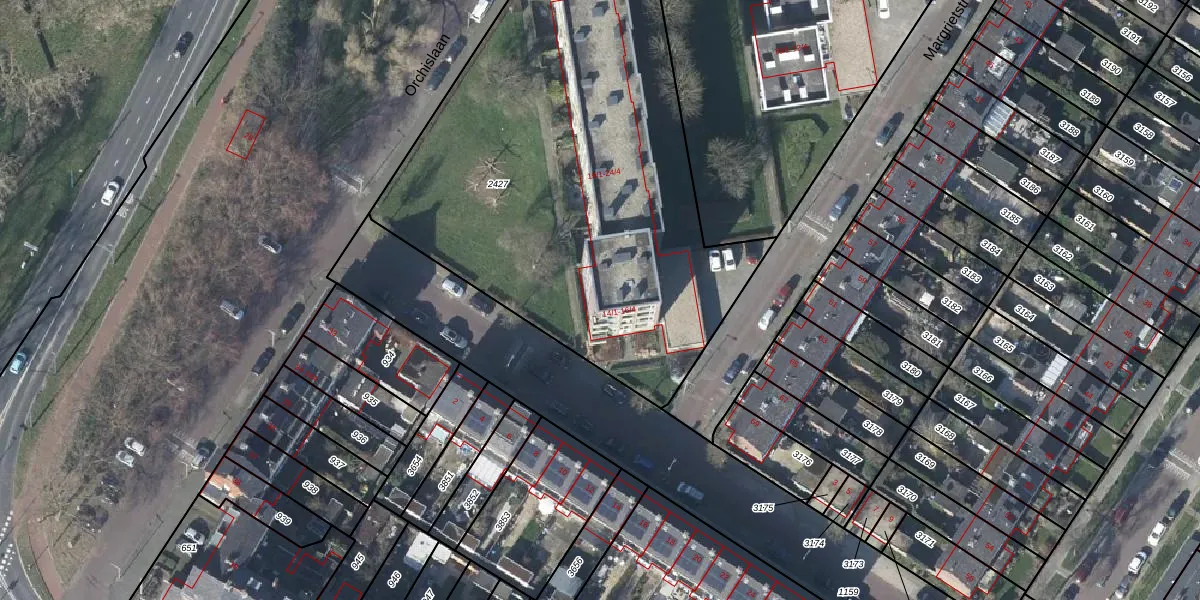 Het perceel waarop Margrietstraat 14-4 staat heeft een oppervlakte van 2715 m². Dit is een zeer groot perceel. De perceeloppervlakte wordt geregistreerd door het Kadaster. Gedetailleerde informatie over de maten van dit perceel kunt u vinden in het rapport Kadastrale kaart met maatvoering van Margrietstraat 14-4.