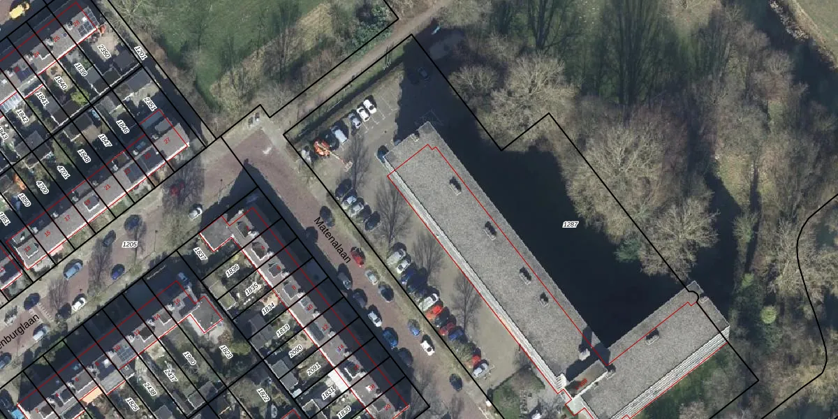 Het perceel waarop Matenalaan 1-D staat heeft een oppervlakte van 5630 m². Dit is een zeer groot perceel. De perceeloppervlakte wordt geregistreerd door het Kadaster. Gedetailleerde informatie over de maten van dit perceel kunt u vinden in het rapport Kadastrale kaart met maatvoering van Matenalaan 1-D.