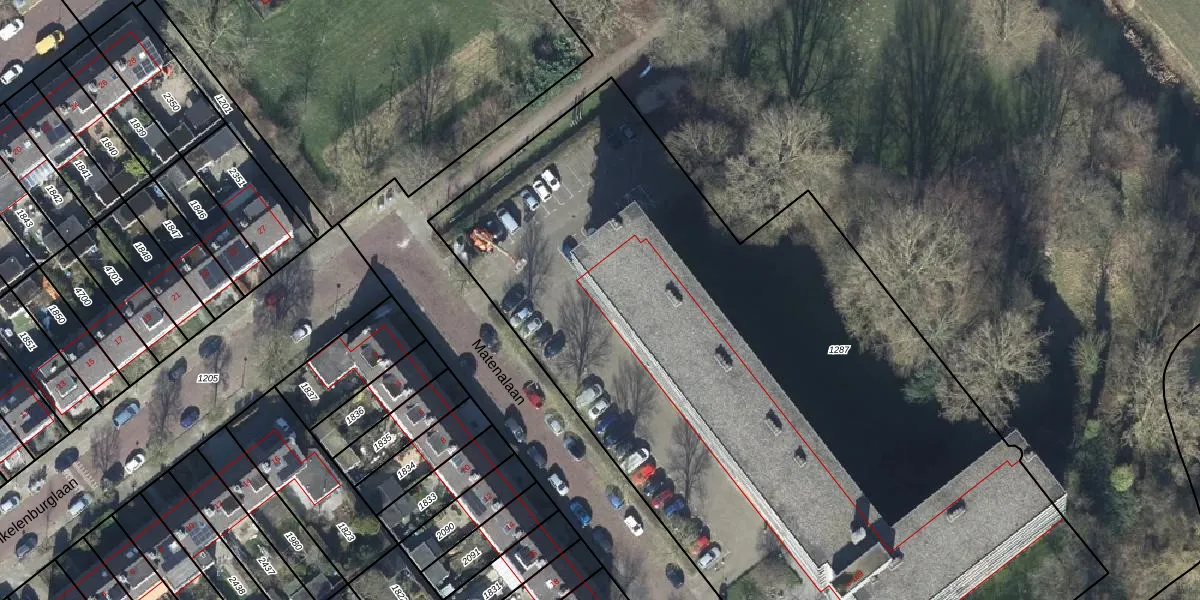 Het perceel waarop Matenalaan 1-B staat heeft een oppervlakte van 5630 m². Dit is een zeer groot perceel. De perceeloppervlakte wordt geregistreerd door het Kadaster. Gedetailleerde informatie over de maten van dit perceel kunt u vinden in het rapport Kadastrale kaart met maatvoering van Matenalaan 1-B.