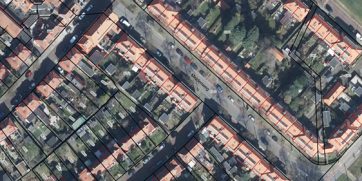 Het perceel waarop Middenweg 33 staat heeft een oppervlakte van 1850 m². Dit is een zeer groot perceel. De perceeloppervlakte wordt geregistreerd door het Kadaster. Gedetailleerde informatie over de maten van dit perceel kunt u vinden in het rapport Kadastrale kaart met maatvoering van Middenweg 33.