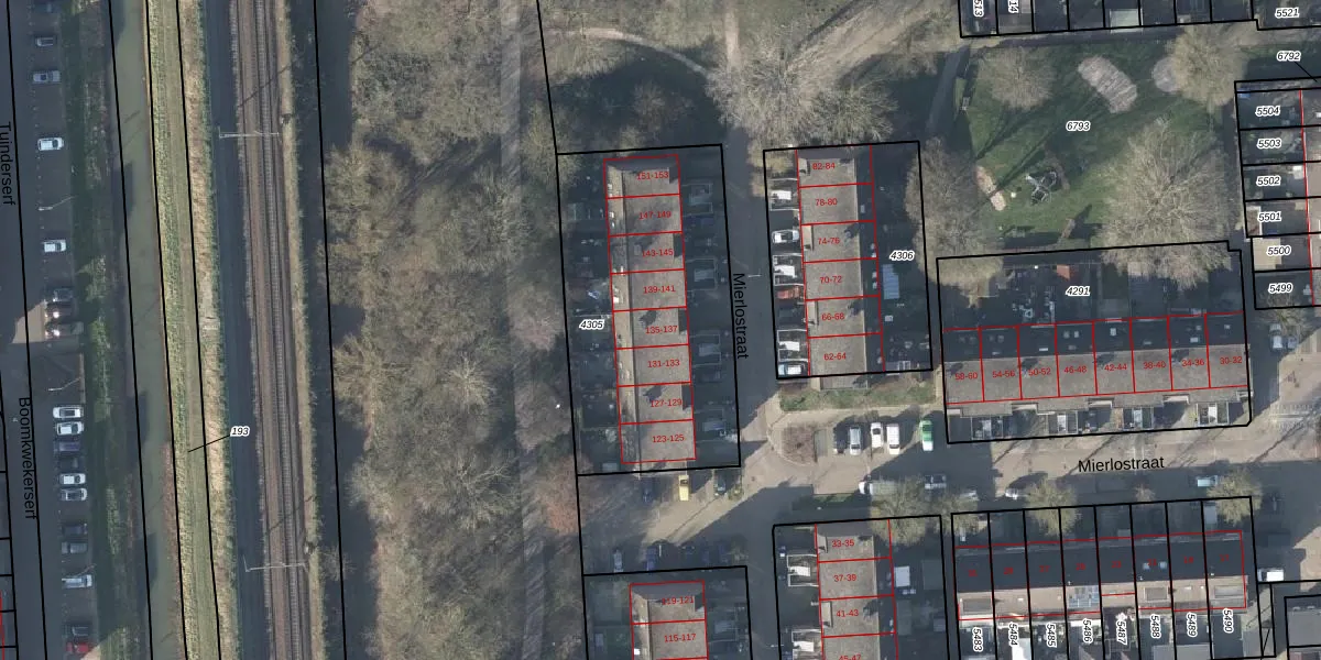 Mierlostraat 135 is gelegen op kadastraal perceel AHM03AC4305. Deze kadastrale aanduiding is uniek en wordt gebruikt door het Kadaster om eigendomsrechten en andere zakelijke rechten vast te leggen. Het perceel maakt onderdeel uit van de kadastrale gemeente Arnhem.