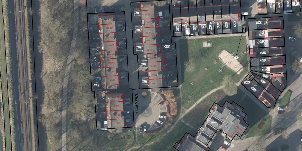 Het perceel waarop Mierlostraat 65 staat heeft een oppervlakte van 1488 m². Dit is een zeer groot perceel. De perceeloppervlakte wordt geregistreerd door het Kadaster. Gedetailleerde informatie over de maten van dit perceel kunt u vinden in het rapport Kadastrale kaart met maatvoering van Mierlostraat 65.