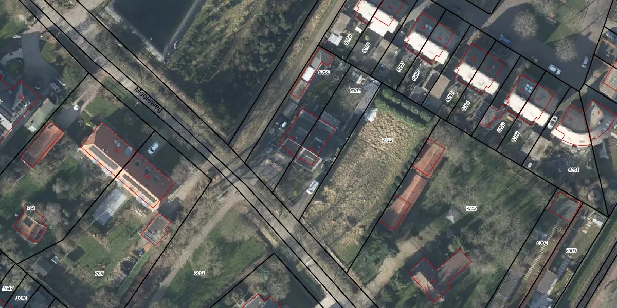 Het perceel waarop Mooieweg 21-B staat heeft een oppervlakte van 597 m². Dit is een groot perceel. De perceeloppervlakte wordt geregistreerd door het Kadaster. Gedetailleerde informatie over de maten van dit perceel kunt u vinden in het rapport Kadastrale kaart met maatvoering van Mooieweg 21-B.