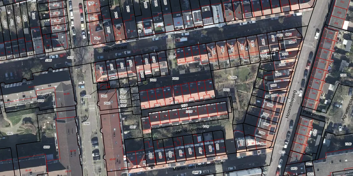 Het perceel waarop Nijhoffstraat 45 staat heeft een oppervlakte van 1087 m². Dit is een zeer groot perceel. De perceeloppervlakte wordt geregistreerd door het Kadaster. Gedetailleerde informatie over de maten van dit perceel kunt u vinden in het rapport Kadastrale kaart met maatvoering van Nijhoffstraat 45.
