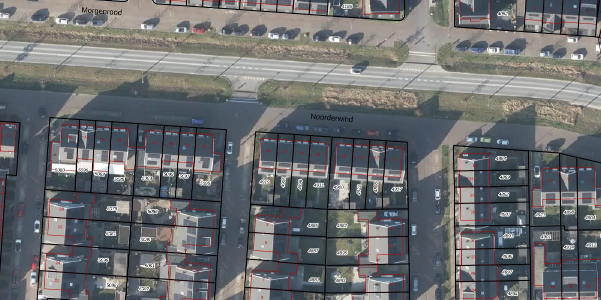 Het perceel waarop Noorderwind 25 staat heeft een oppervlakte van 131 m². Dit is een middelgroot perceel. De perceeloppervlakte wordt geregistreerd door het Kadaster. Gedetailleerde informatie over de maten van dit perceel kunt u vinden in het rapport Kadastrale kaart met maatvoering van Noorderwind 25.