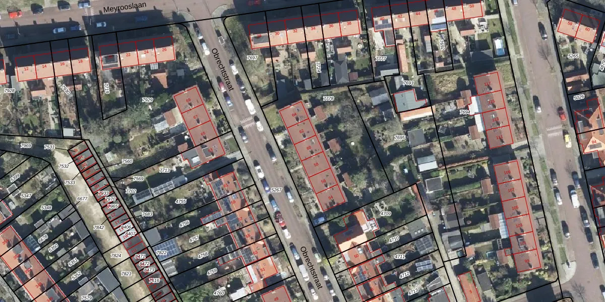 Het perceel waarop Obrechtstraat 60 staat heeft een oppervlakte van 1980 m². Dit is een zeer groot perceel. De perceeloppervlakte wordt geregistreerd door het Kadaster. Gedetailleerde informatie over de maten van dit perceel kunt u vinden in het rapport Kadastrale kaart met maatvoering van Obrechtstraat 60.