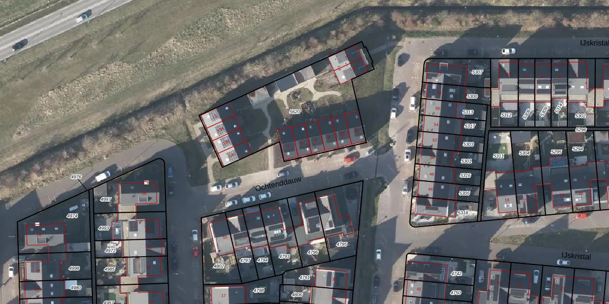 Het perceel waarop Ochtenddauw 4 staat heeft een oppervlakte van 1287 m². Dit is een zeer groot perceel. De perceeloppervlakte wordt geregistreerd door het Kadaster. Gedetailleerde informatie over de maten van dit perceel kunt u vinden in het rapport Kadastrale kaart met maatvoering van Ochtenddauw 4.