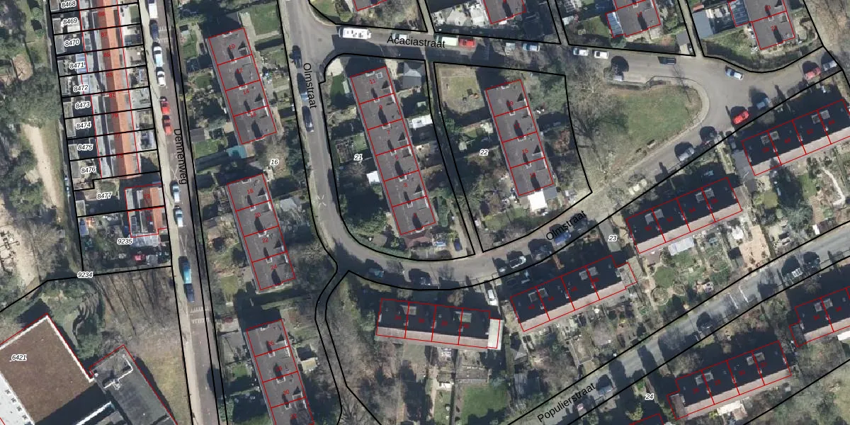Het perceel waarop Olmstraat 1 staat heeft een oppervlakte van 1210 m². Dit is een zeer groot perceel. De perceeloppervlakte wordt geregistreerd door het Kadaster. Gedetailleerde informatie over de maten van dit perceel kunt u vinden in het rapport Kadastrale kaart met maatvoering van Olmstraat 1.