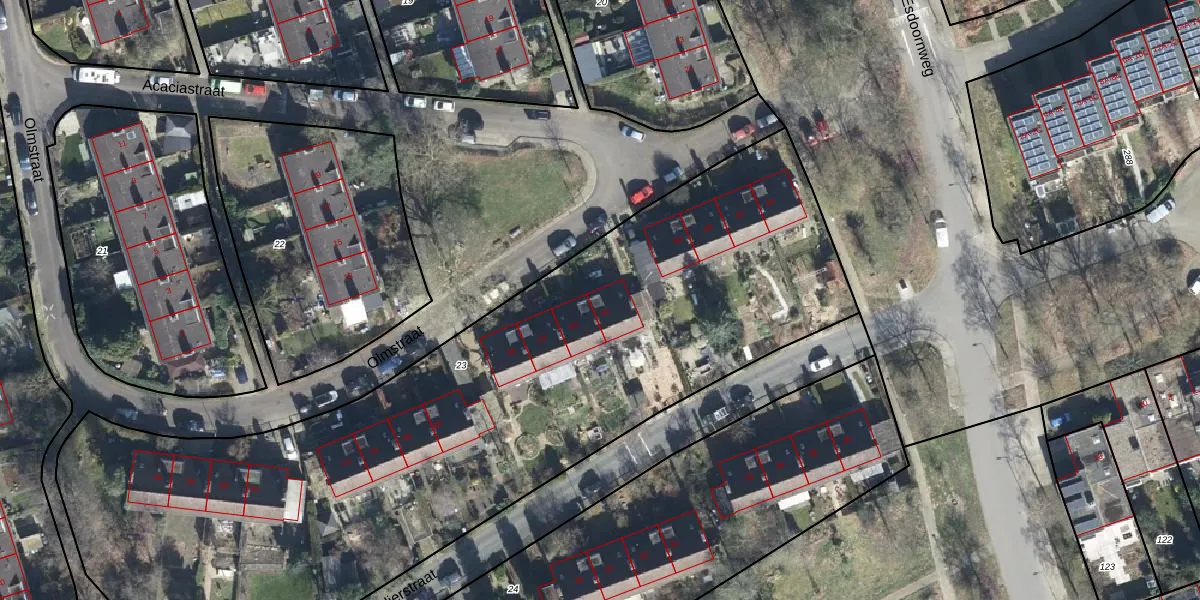 Het perceel waarop Olmstraat 56 staat heeft een oppervlakte van 4460 m². Dit is een zeer groot perceel. De perceeloppervlakte wordt geregistreerd door het Kadaster. Gedetailleerde informatie over de maten van dit perceel kunt u vinden in het rapport Kadastrale kaart met maatvoering van Olmstraat 56.